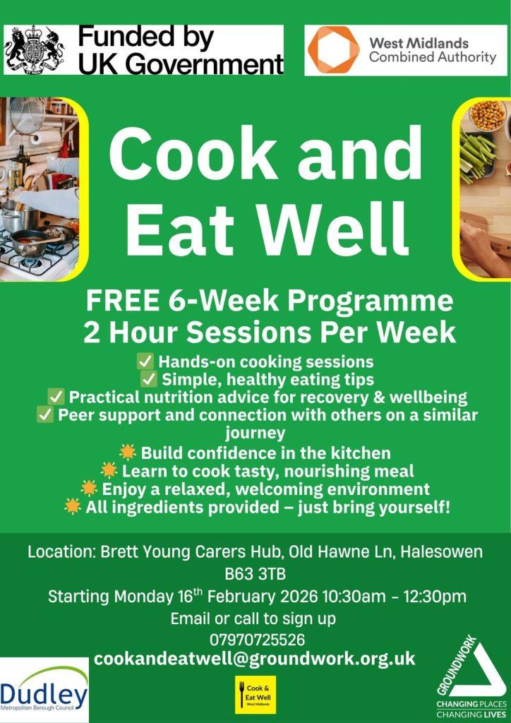 Do you want to learn more about healthy eating and cooking? Would you like to get together with others at a free cooking club? We are offering a free six week programme ‘Cook well, eat well’ at Brett Young Carers Hub in Halesowen. The community programme is open to anyone who wants to learn about cooking for health and vitality. Advice is also on offer to anyone with specific health issues like obesity or diabetes. It’s a two hour session each week for six weeks and starts on 16 February from 10.30 – 12.30. All are welcome and it’s great fun. Email or call to sign up!