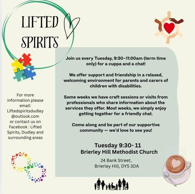 Lifted Spirits is a warm and welcoming group for parents and carers of children with disabilities. Some sessions include crafts and visits from professionals to share information and support. You can join every Tuesday from 9:30am -11am term time only at Brierley Hill Methodist Church.